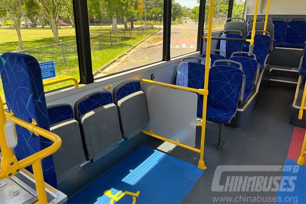 The two-door configuration offers 17 fixed seats plus two wheelchair bays. When not in use, the wheelchair areas can accommodate seven folding seats to enhance peak-hour operational efficiency. The cockpit layout, visibility, and control logic mirror those of full-size city buses, minimizing driver training costs and enabling flexible fleet scheduling across different models.