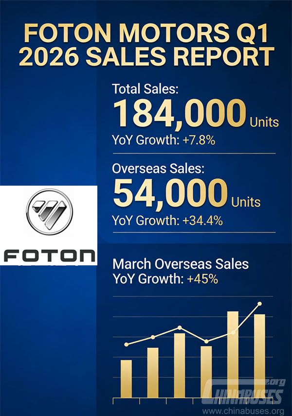 In the first quarter of 2026, Foton Motor achieved total sales of 184,000 units, an increase of 7.8% year-on-year (YoY), with overseas sales reaching 54,000 units, up 34.4% YoY. In March alone, overseas sales skyrocketed 45% YoY. Behind this impressive performance, the bus segment stands out as a core growth driver, executing an "ecological rootedness" strategy to transition from product export to local integration—setting an important benchmark for high-quality global expansion in China's commercial vehicle industry.
